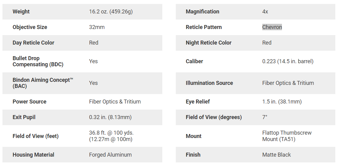 The TA31RCO is an Advanced Combat Optical Gunsight (ACOG) designed for the US Army's M4 weapon system (14.5" barrel). It incorporates dual illumination technology using a combination of fiber optics and self-luminous tritium. This allows the aiming point to always be illuminated without the use of batteries. The tritium illuminates the aiming point in total darkness, and the fiber optic self-adjusts reticle brightness during daylight according to ambient light conditions. This allows the operator to keep both eyes open while engaging targets and maintaining maximum situational awareness. Designed to the exact specifications of the United States Marine Corps, the unique reticle pattern provides quick target acquisition at close combat ranges while providing enhanced target identification and hit probability out to 800 meters utilizing the Bullet Drop Compensator. No tools are needed for windage and elevation adjustments because the TA31RCO features external adjusters, making it waterproof up to 11m without the caps. Mounting bosses are integrated into the housing by the eyepiece to allow the easy addition of a Trijicon RMR® (not included).