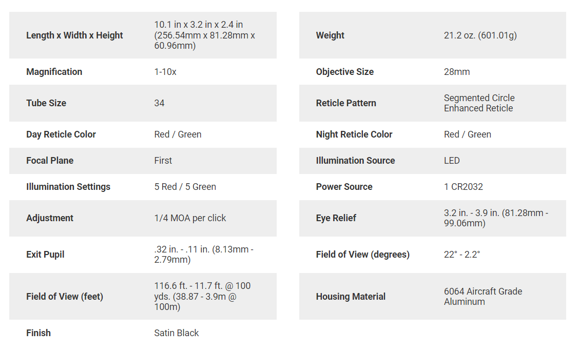 Get rapid target engagement and long-range precision from the same hunting riflescope—the Trijicon Credo® HX 1-10x28. This tough-as-nails illuminated riflescope gives you exposed return-to-zero adjusters, fully multi-coated, broadband, anti-reflective glass, a 34mm tube, and a 28mm objective lens for more exit pupil and low light performance. The Credo HX 1-10x28 features a dual red/green illuminated Segmented Circle Enhanced Reticle for hunting in any condition and environment.