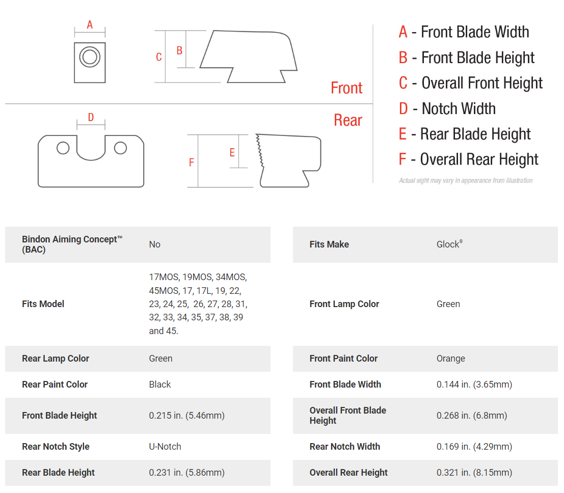 NOTE: Professional installation recommended. Dimensions for reference only. The HD MOS Fit sights are NOT intended to be used while also running a red dot, as they are not tall enough to be viewed through the red dot window.