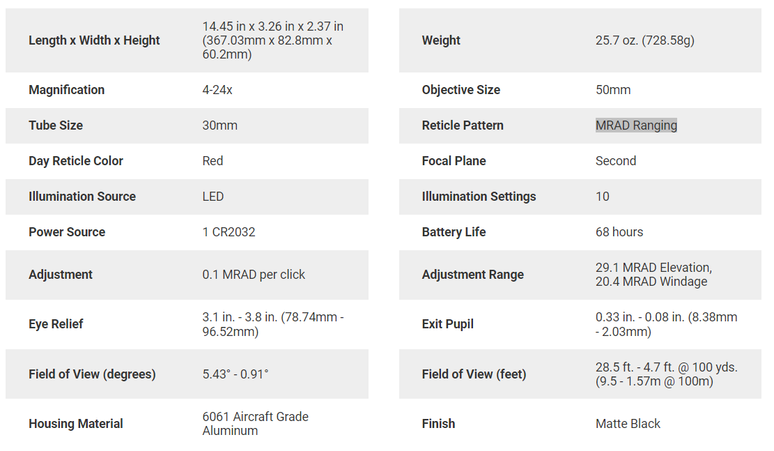 You shouldn’t have to “baby” your long-range riflescope. That’s why we made the Tenmile® line. It’s built to take a beating and maintain your zero. And when you want to push farther out, its excellent light transmission, user-selectable LED illumination and crisp, precise adjustments give you the precision you need to make the hit. The Tenmile 4-24x50 features premium glass coatings, a second focal plane MRAD Ranging reticle with daylight bright illumination, and exposed zero stop elevation adjuster.
