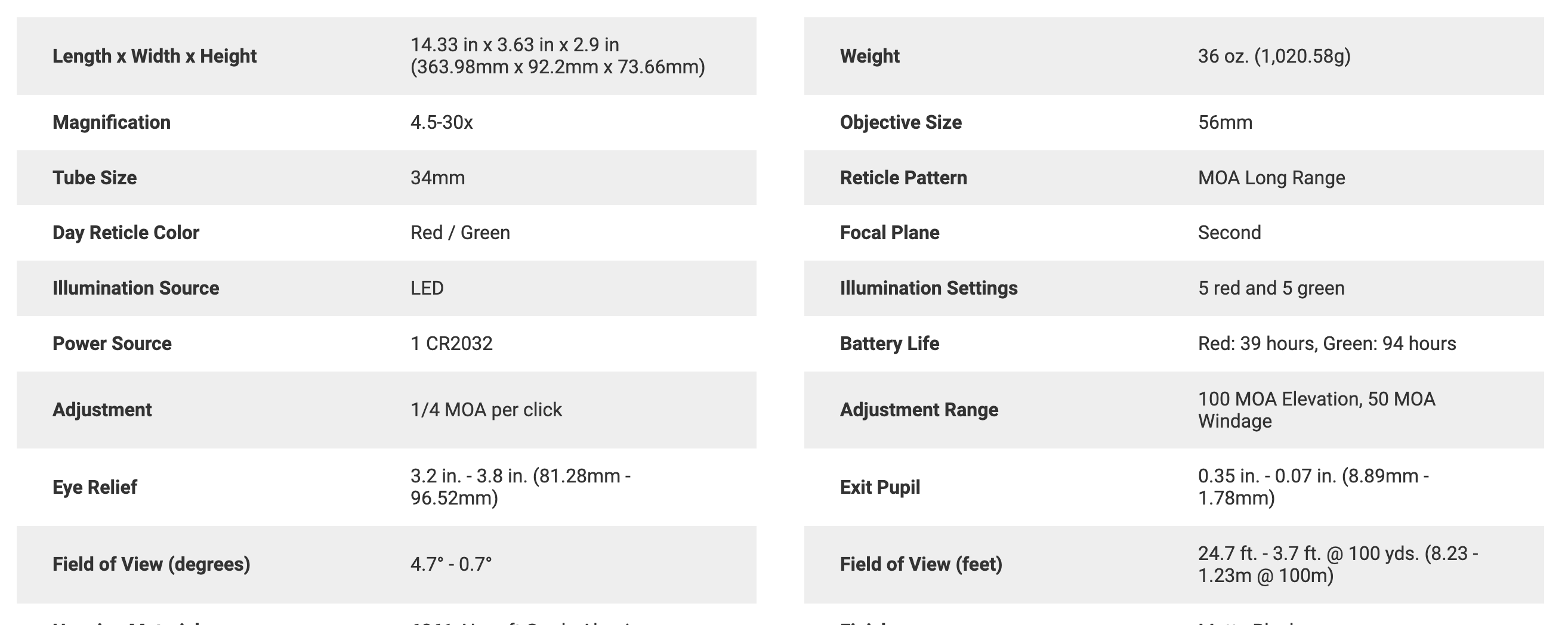 Excellent light transmission. Pinpoint accuracy in any condition. Uncompromised durability. These are the features that set the Trijicon Tenmile® 4.5-30x56 long-range riflescope apart. The 34mm tube provides generous elevation and windage adjuster travel. You can also expect crisp, precise adjustments with zero stop; extra-low dispersion glass for true color and detail without distortion; and dual red/green illuminated reticles that let you enjoy “both-eyes-open” shooting for fast engagement.